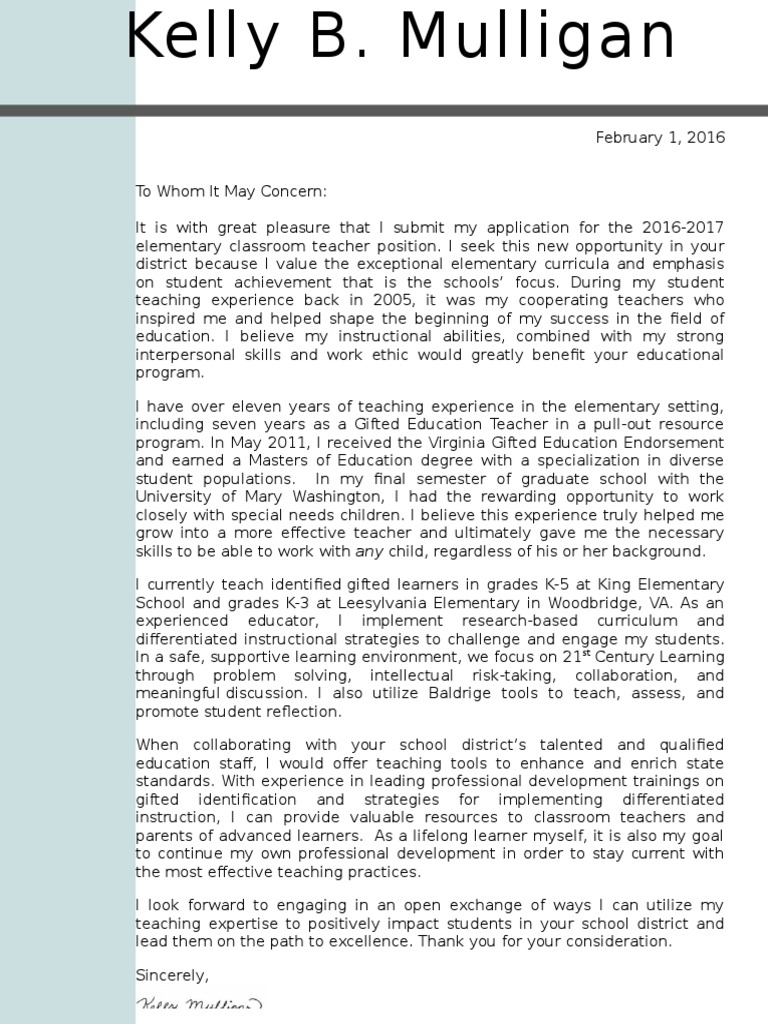 Have you ever been told you don't need a cover letter for a teaching position? On average, your cover letter should be from 250 to 400 words long. When composing an official or service letter, presentation style as well as layout is vital to earning a good first impact. 0 ratings0% found this document useful (0 votes). A portfolio of your work.